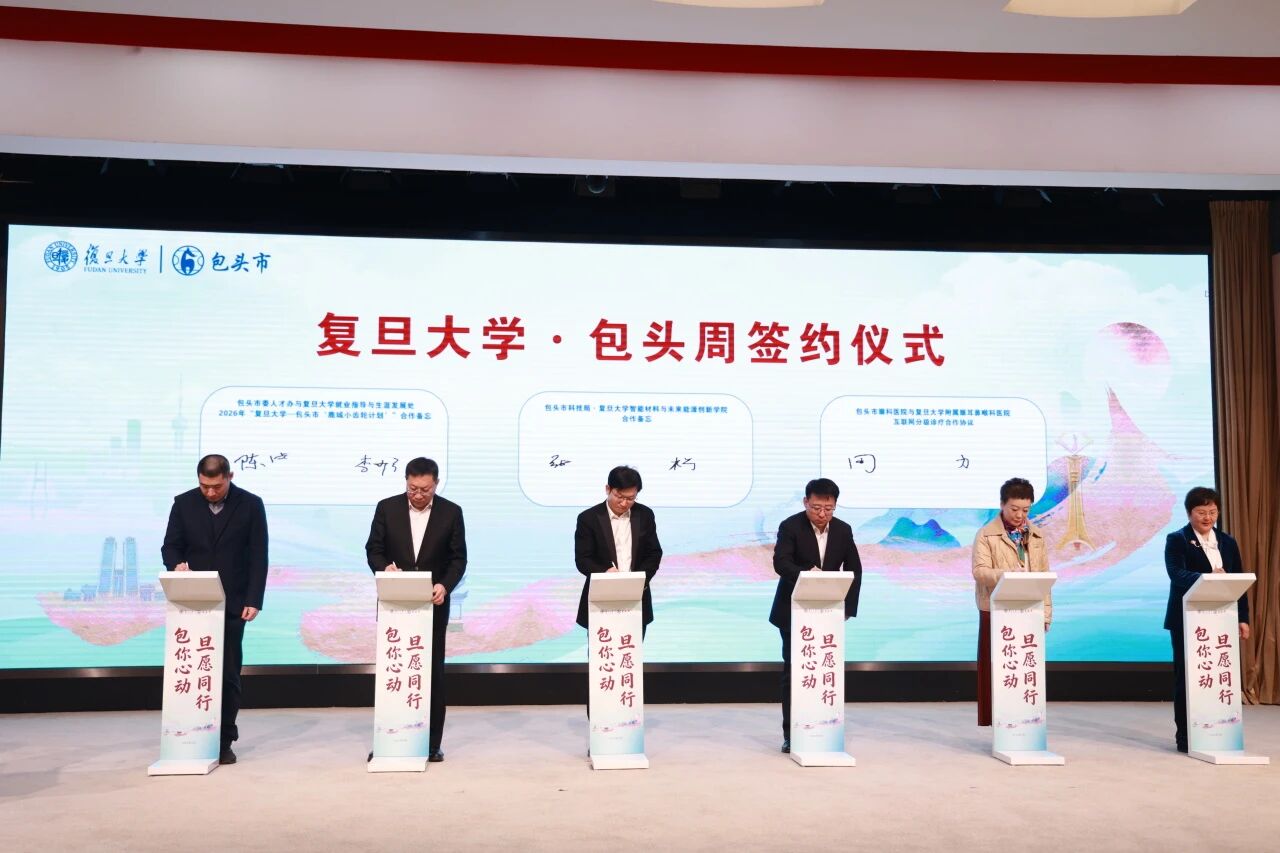 包头市与复旦大学签订2026年“复旦大学—包头市‘鹿城小齿轮计划’”合作备忘录,包头市眼科医院与复旦大学眼耳鼻喉医院签订“互联网分级诊疗合作协议,包头市与复旦大学智能材料与未来能源创新学院签订合作框架协议。一系列合作协议的签订和工作站的揭牌,将成为校地深化合作的重要纽带,推动双方合作走深走实、落地见效。